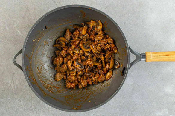 Den Knoblauch und die Pilze in einer großen Pfanne oder einem Wok mit 2EL Pflanzenöl bei mittlerer Hitze ca. 3Min. anbraten. Das Hackfleisch und die Sauce zugeben und 3–5Min. köcheln lassen, bis das Hackfleisch gar ist, dabei gelegentlich umrühren.