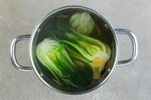 Den Pak Choi halbieren und in der Brühe ca. 3Min. kochen, aus dem Topf nehmen und beiseitestellen.