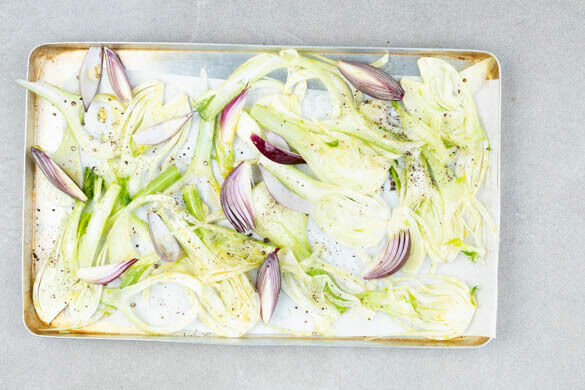 Den Fenchel der Länge nach in dünne Streifen schneiden, dabei die Stiele entfernen. Die Zwiebeln schälen, halbieren und jede Hälfte in 4 Spalten schneiden. Das Gemüse mit 2EL Olivenöl und je 1 kräftigen Prise Salz und Pfeffer vermengen und auf einem zweiten mit Backpapier ausgelegten Backblech 7–10Min. im Ofen rösten.