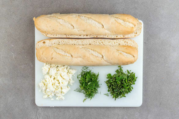 Die Baguettebrötchen längs halbieren. Den Feta mit den Fingern oder einer Gabel zerkrümeln. Die Minzeblätter abzupfen und fein schneiden. Den Dill samt Stängeln fein schneiden.
