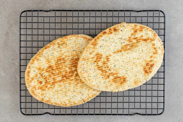 Die Naanbrote mit etwas Wasser besprenkeln und 5–6Min. im Ofen erwärmen.