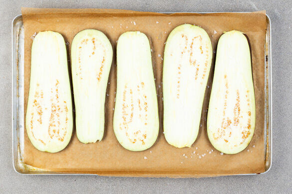 Inzwischen die Aubergine der Länge nach in 0,5–1cm dünne Scheiben schneiden. Auf ein mit Backpapier ausgelegtes Backblech geben, mit 1 Prise Salz würzen und ca. 10Min. im Ofen vorbacken.