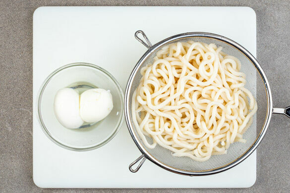 Die Nudeln in das kochende Wasser geben und in 2–3Min. bissfest kochen, dabei zwischendurch umrühren, um die Nudeln voneinander zu trennen. Mit einer Tasse etwas Kochwasser abschöpfen, die Nudeln mit einer Schaumkelle in ein Sieb geben, kalt abschrecken und beiseitestellen. Das Wasser erneut aufkochen, die Eier hineingeben, in ca. 6Min. weich kochen und kalt abschrecken.