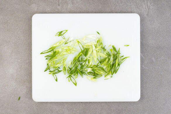 Die Lauchzwiebel schräg in feine Ringe schneiden.