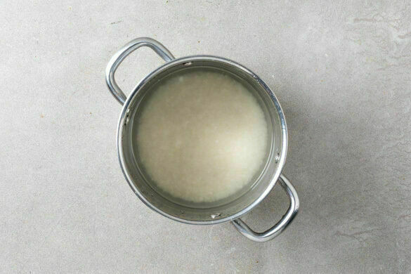 Den Backofen auf 230°C (210°C Umluft) vorheizen. In einem mittelgroßen Topf 600ml leicht gesalzenes Wasser zum Kochen bringen. Den Reis in einem Sieb kalt abspülen, bis das Wasser klar bleibt. Sobald das Wasser kocht, den Reis hineingeben und abgedeckt bei niedrigster Hitze 18–20Min. kochen, bis das Wasser aufgesogen und der Reis gar ist. Noch ca. 5Min. ohne Hitzezufuhr ziehen lassen.