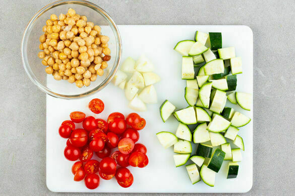 In einem mittelgroßen Topf 850ml leicht gesalzenes Wasser zum Kochen bringen. Die Zwiebeln schälen, halbieren und in ca. 2cm große Würfel schneiden. Die Zucchini längs vierteln und ebenfalls in ca. 2cm große Würfel schneiden. Die Kirschtomaten halbieren. Die Kichererbsen in einem Sieb mit kaltem Wasser abspülen und abtropfen lassen.