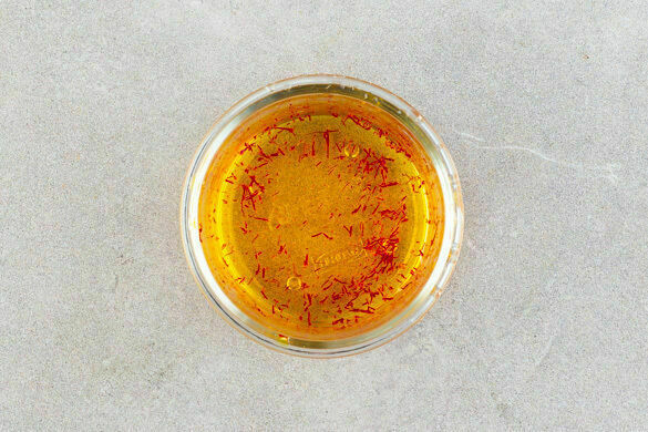 50ml Kochwasser abschöpfen und den Safran damit übergießen. Gut umrühren, damit sich die Aromen entfalten können, und ca. 5Min. einweichen lassen.