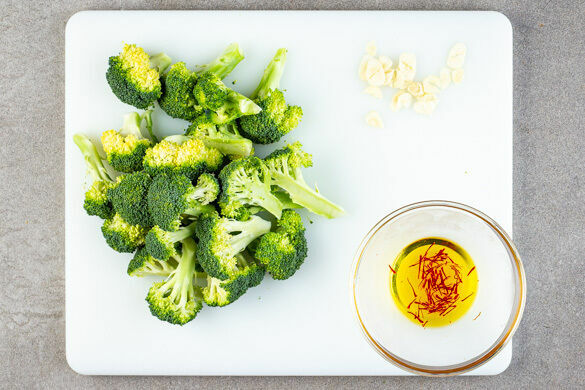 Den Brokkoli in mundgerechte Röschen zerteilen. Tipp: Wer mag, kann den Brokkolistrunk schälen und klein schneiden. Den Knoblauch schälen und in feine Scheibchen schneiden. Den Safran in 4EL warmen Wasser einweichen.