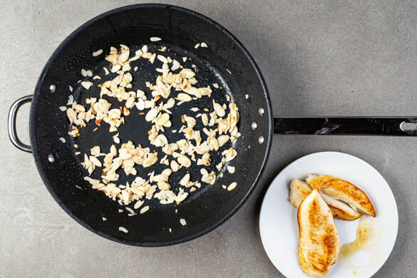 Das Fleisch trocken tupfen, horizontal halbieren und mit 1EL Olivenöl sowie 1/2TL Salz einreiben. In einer zweiten Pfanne bei starker Hitze auf jeder Seite 2–4Min. scharf anbraten, bis es goldbraun und gar ist. Das Fleisch auf einem Teller beiseitestellen und die Mandeln im Bratfett bei mittlerer Hitze 1–2Min. goldbraun anrösten. Zum Abkühlen aus der Pfanne nehmen.