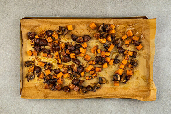 Den Backofen auf 240°C (220°C Umluft) vorheizen. Die Pilze je nach Größe halbieren oder vierteln. Die Süßkartoffeln samt Schale in ca. 2cm große Würfel schneiden.