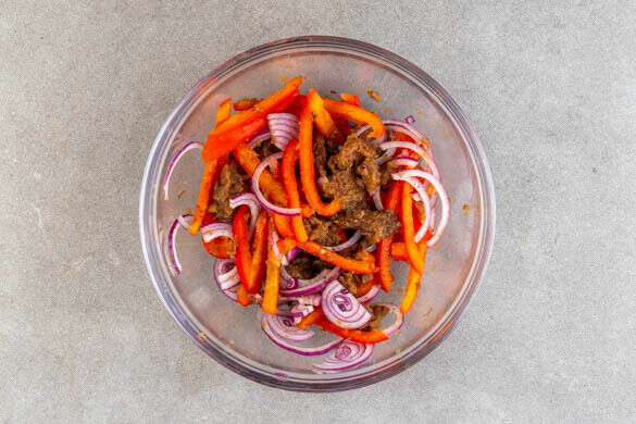 Die Paprika und die Zwiebeln mit dem veganen Rindergulasch, 1EL Olivenöl und 1 kräftigen Prise Salz vermengen, mit Pfeffer abschmecken.