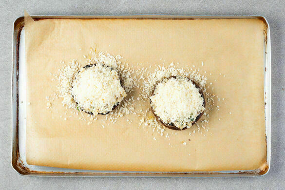 Den restlichen Käse mit dem Panko-Paniermehl vermengen. Die Pilze aus dem Ofen nehmen und jeweils mit etwas Trüffelrisotto füllen. Mit dem Käse-Panko-Mix bestreuen und erneut ca. 5Min. im Ofen backen, bis der Käse-Panko-Mix goldbraun ist.