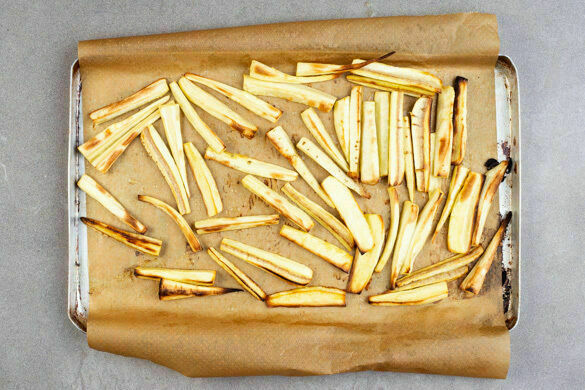 Den Backofen auf 240°C (220°C Umluft) vorheizen. Die Pastinaken längs vierteln und in dünne Spalten schneiden. Mit 2EL Olivenöl und 1TL Salz vermengen, gleichmäßig auf zwei mit Backpapier ausgelegten Backblechen verteilen und im Ofen in 18–20Min. goldbraun und knusprig rösten. Nach der Hälfte der Zeit die Position der Bleche tauschen. Bei geöffneter Ofentür ca. 5Min. abkühlen lassen.