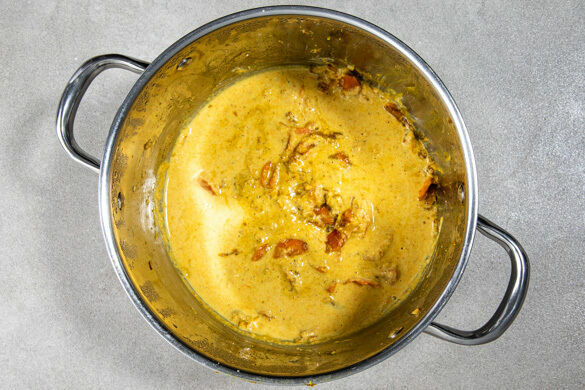 Ca. ¼ des gegarten Gemüses zur Kokosmilch und den Mandeln in das hohe Gefäß geben und alles mit einem Stabmixer möglichst glatt pürieren. Die Sauce zum übrigen Gemüse in den Topf gießen und gut unterrühren.