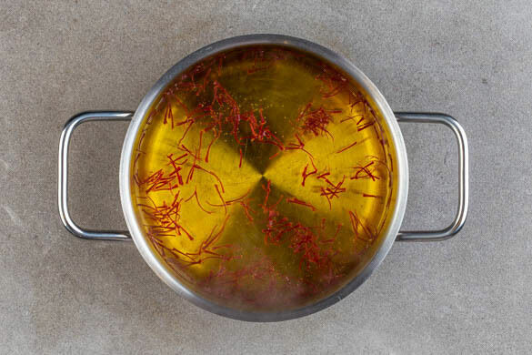 In einem mittelgroßen Topf 600ml leicht gesalzenes Wasser mit dem Safran zum Kochen bringen.