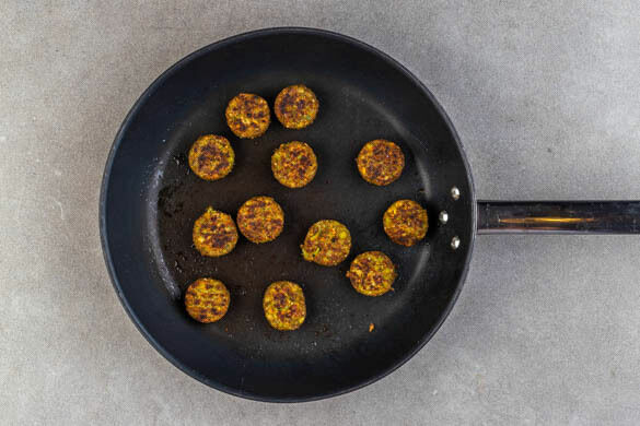Die Falafeln in einer großen Pfanne mit 2EL Olivenöl bei mittlerer Hitze in 4–6Min. rundum goldbraun braten.