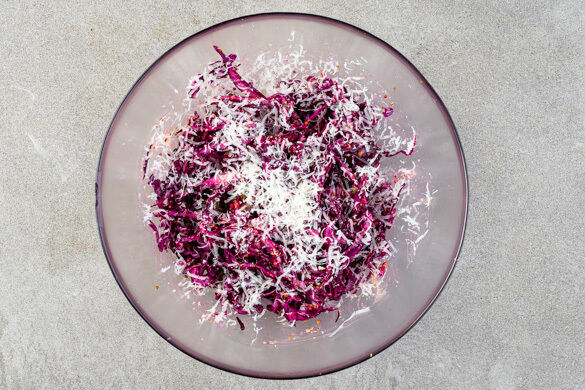 Den Käse fein reiben. Den Rotkohl mit dem Dressing vermengen, dann den Käse unterheben. Die Flammkuchen nach Belieben in Stücke schneiden, mit dem Fenchelgrün garnieren und mit dem Rotkohlsalat servieren.