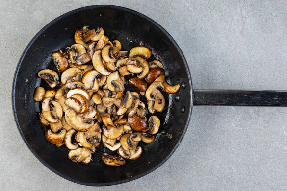 Die Zwiebelwürfel, die ½ des Knoblauchs und die Pilze in einer großen Pfanne mit 1EL Olivenöl bei mittlerer bis starker Hitze in ca. 5Min. weich braten. Den Käse fein reiben und mit der Pilz-Mischung, ½TL getrocknetem Oregano sowie 1TL Butter in einem hohen Gefäß mit einem Stabmixer zu einer Creme pürieren. Die Pfanne auswischen.