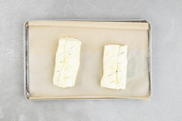 Die Teigpäckchen mit dem Backpapier auf ein Backblech geben und ca. viermal diagonal einschneiden. Die Strudel im Ofen 30–35Min. backen, bis sie goldbraun und knusprig sind. Tipp: Für extra Glanz die Teige vor dem Backen mit Wasser oder verquirltem Ei bestreichen.