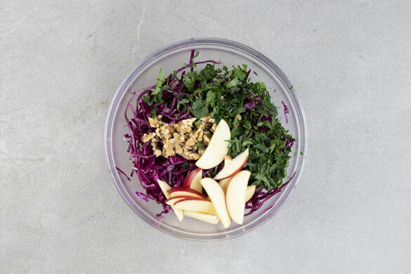 Die Walnüsse und die Petersilie samt Stängeln grob schneiden. Den Apfel vierteln, entkernen, in dünne Scheiben schneiden und mit dem Rotkohl, den Walnüssen, der Petersilie, 2EL Olivenöl, 2EL Essig sowie je 1 kräftigen Prise Salz und Pfeffer zu einem Salat vermengen. Den Thymian entfernen, die Sauce mit den Strudeln anrichten und mit dem Salat servieren.