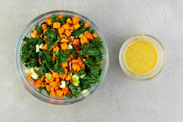 Die Äpfel vierteln, entkernen und in ca. 1cm große Würfel schneiden. Die Strünke entfernen, den Grünkohl in Stücke zupfen und mit ½TL Salz 1–2Min. kräftig durchkneten. 4EL Olivenöl, 2EL Essig, 1–2EL Wasser, 1½EL Senf und je 1 kräftige Prise Zucker und Salz verrühren. Grünkohl, Äpfel, Süßkartoffeln und Nüsse kurz vor dem Servieren mit dem Dressing vermengen.