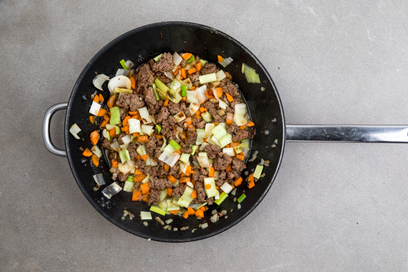 Den Lauch und die Karotten zum Hack in die Pfanne geben und 1–2Min. mitbraten. Mit 2EL Mehl bestäuben und verrühren, dann mit 400ml Wasser ablöschen. Das Brühgewürz hinzugeben und alles ca. 3Min. sanft einköcheln lassen. Mit Salz und Pfeffer abschmecken.