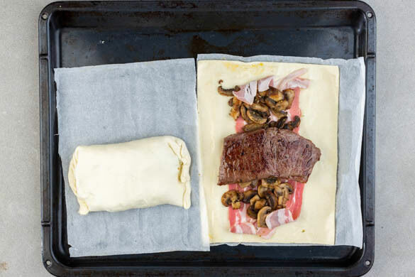 Die Teige mit dem Papier nach unten ausrollen, halbieren und mit den Serranoscheiben belegen. Die Pilze und das Fleisch daraufgeben. Den Teig quer über das Fleisch falten, sodass vier kurze Päckchen entstehen, die Enden zusammendrücken. Mit dem Papier auf ein Backblech legen, mit 4EL Milch oder einem verquirlten Ei bestreichen und in 24–26Min. im Ofen goldgelb backen.