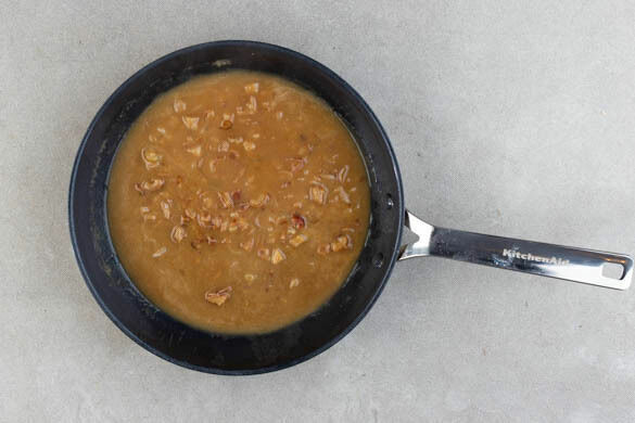 Die Schalotten schälen, halbieren und in feine Streifen schneiden. In der Fleischpfanne mit 2EL Butter und 1 Prise Salz bei mittlerer Hitze 1–2Min. anschwitzen, mit 2TL Mehl bestäuben und ca. 1Min. weiterbraten. Die Datteln samt Flüssigkeit in die Pfanne geben und das Brühgewürz unterrühren. Die Hitze reduzieren und die Sauce ca. 5Min. einköcheln lassen.