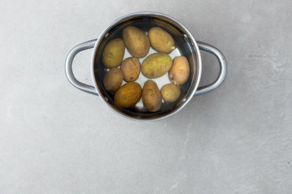 Den Backofen auf 240°C Umluft (260°C Ober-/Unterhitze) vorheizen. Sehr große Kartoffeln halbieren. In einem großen Topf ausreichend gesalzenes Wasser zum Kochen bringen, die Kartoffeln hineingeben und ca. 10Min. vorkochen. In ein Sieb abgießen und abtropfen lassen. Den Topf aufbewahren.