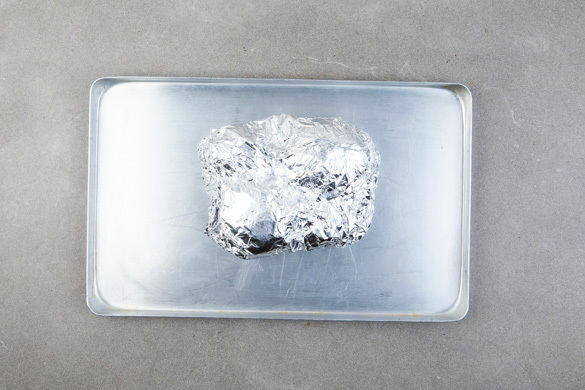 Die Kartoffeln in Alufolie einwickeln, auf ein Backblech geben und 15–20Min. im Ofen backen, bis sie gar sind. Tipp: Die Kartoffeln sind durch, wenn sie sich bei der Messerprobe leicht vom Messer lösen.