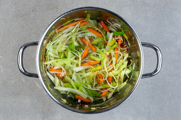 500ml Wasser in einem Wasserkocher aufkochen. Den Ingwer schälen, grob reiben und mit dem Gemüsemix sowie ½TL Salz in einem mittelgroßen Topf mit 1EL Pflanzenöl bei mittlerer Hitze ca. 3Min. anbraten.