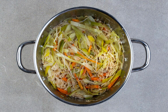 Den Reis in einem Sieb kalt abspülen, bis das Wasser klar bleibt, dann in den Topf zu dem Gemüse geben. Die Zwiebelmarmelade einrühren und das kochende Wasser angießen. Den Reis aufkochen und abgedeckt bei niedriger Hitze 18–20Min. kochen, bis das Wasser aufgesogen und der Reis gar ist, dabei gelegentlich umrühren. Noch ca. 5Min. ohne Hitzezufuhr ziehen lassen.