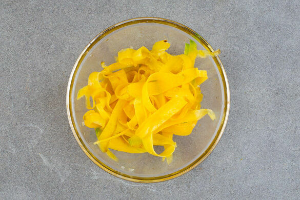 2EL hellen Essig gründlich mit 1TL Zucker und 1 Prise Salz verrühren. Die Karotte ggf. schälen und mit einem Sparschäler in breite Streifen schneiden. Den Einlegesud vorsichtig in die Karottenstreifen einmassieren.