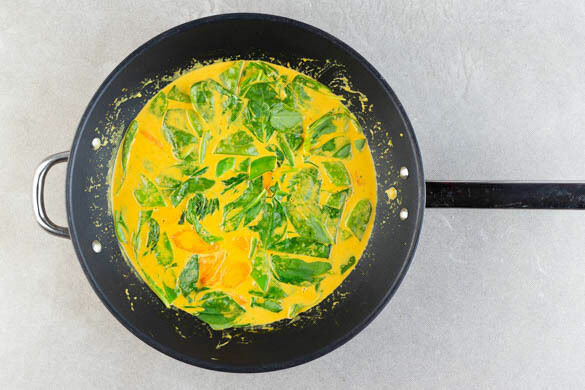Die Karotten mit in die Pfanne geben und das Curry ca. 5Min. köcheln lassen.