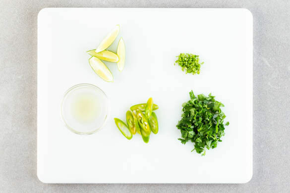 Die Limette halbieren und eine Hälfte auspressen, die andere Hälfte in Spalten schneiden. Die Korianderblätter von den Stängeln zupfen und grob schneiden. Die Korianderstängel fein schneiden. Die Peperoni in feine Scheiben schneiden. Tipp: Wer es weniger scharf mag, entfernt die Kerne oder verwendet ggf. nicht die ganze Peperoni.