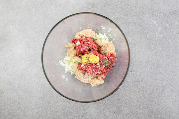 Das Hackfleisch mit der ½ der Zwiebeln, den eingeweichten Semmelbröseln und 2EL Senf verkneten. Mit je 2 kräftigen Prise Salz und Pfeffer würzen und zu 4 gleich großen Pattys formen.