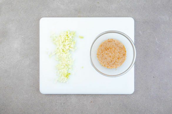 Den Backofen auf 200°C (180°C Umluft) vorheizen. Die Zwiebeln schälen, halbieren und in feine Würfel schneiden. Die Semmelbrösel in 3–4EL Wasser einweichen.