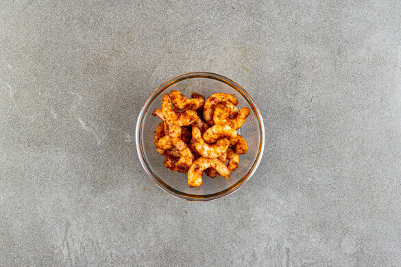 Die Garnelen in einem Sieb mit kaltem Wasser abspülen und mit etwas Küchenkrepp trocken tupfen, dann mit der Cajun-Gewürzmischung, 1TL Honig, ½TL Salz und 1 Prise Pfeffer vermengen.