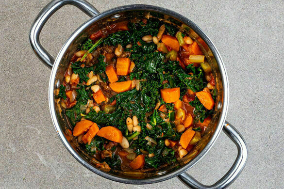 „Ribollita" ist eine toskanische Brotsuppe, die traditionell aus „Resten von gestern" zubereitet wird. Bei uns kommen heute nebst luftigem Baguette deftiger Grünkohl, leckere Böhnchen, aromatischer Sellerie und knackige Karotte in den Topf, verfeinert wird das Gericht mit veganen Hefeflocken. Ach ja: Und natürlich ist hier nichts von adeliger Herkunft, sondern alles schön frisch – und wie es duftet! Mmmh!