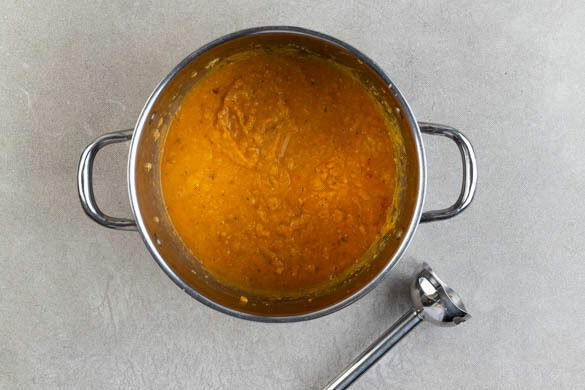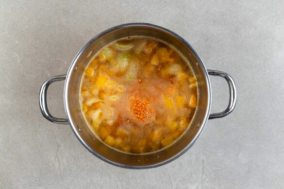 Das Gemüse mit 600ml Wasser ablöschen und aufkochen, dann die ½ der Linsen mit 1TL Salz einrühren und abgedeckt bei mittlerer Hitze 15–18Min. köcheln lassen.