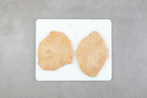Auf tiefen Tellern 2EL Weizenmehl, 1 verquirltes Ei sowie die Semmelbrösel bereitstellen. Die Schnitzel von beiden Seiten mit je 1 Prise Salz und Pfeffer würzen und der Reihe nach im Mehl, im Ei und in den Semmelbröseln wenden. Dabei darauf achten, dass alles gleichmäßig bedeckt ist und die Panade ggf. noch leicht andrücken.