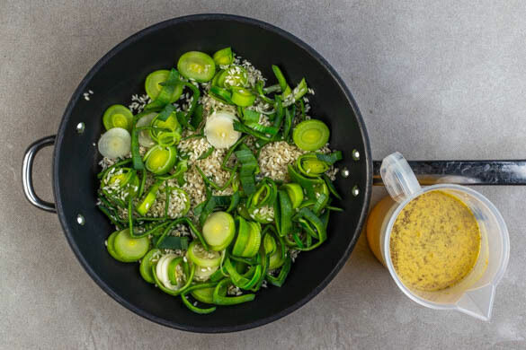 Das Brühgewürz in 1,5L heißem Wasser auflösen. Den Lauch und den Reis in einer großen Pfanne mit 2EL Olivenöl bei starker Hitze 1–2Min. anbraten, dabei regelmäßig umrühren.