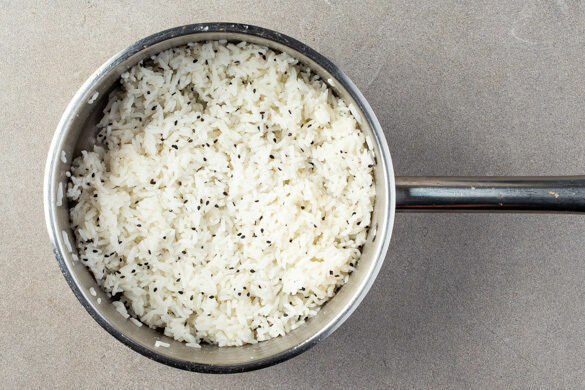 Den Reis in einem Sieb unter fließendem Wasser abspülen, bis das Wasser klar bleibt. Sobald das Wasser kocht, den Reis hineingeben und abgedeckt bei niedrigster Hitze 10–12Min. kochen, bis das Wasser aufgesogen und der Reis gar ist. Noch ca. 5Min. ohne Hitzezufuhr ziehen lassen.