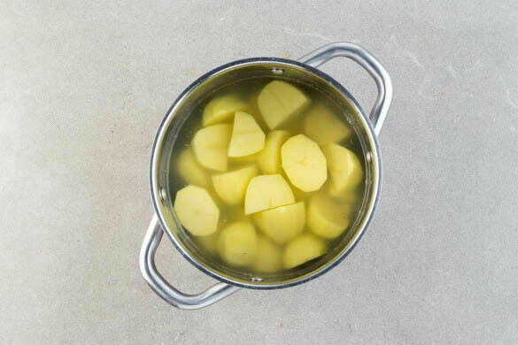 Die Kartoffeln schälen, je nach Größe halbieren oder vierteln und mit dem Brühgewürz in das kochende Wasser geben. Die Kartoffeln in ca. 15Min. gar kochen. In ein Sieb abgießen, dabei 200ml Brühe auffangen.