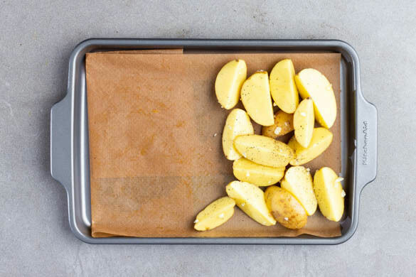 Den Backofen auf 220°C (200°C Umluft) vorheizen. Die Kartoffeln samt Schale in ca. 2cm breite Spalten schneiden. Den Knoblauch schälen und fein würfeln. Die Kartoffeln auf einer Seite eines mit Backpapier ausgelegten Backblechs geben und mit dem Knoblauch, ½EL Olivenöl sowie je ½TL Salz und Pfeffer einreiben.
