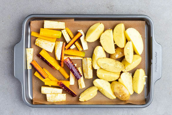 Die Pastinake und die Karotten ggf. schälen, dann jeweils längs halbieren und in ca. 5cm lange Stücke schneiden. Auf die freie Seite des Backblechs geben und mit der ½ der Gewürzmischung, ½EL Olivenöl sowie je 1 kräftigen Prise Salz und Pfeffer vermengen. Das Gemüse im Ofen in 20–25Min. goldbraun und gar backen.