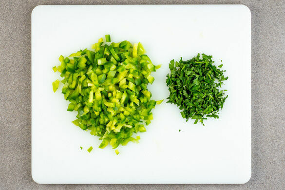 Die Paprika vierteln, entkernen und in ca. 0,5cm kleine Würfel schneiden. Die Petersilie samt Stängeln fein hacken.