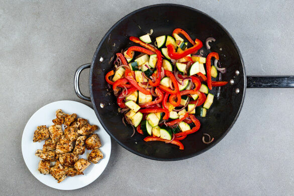 Das Fleisch in einer großen Pfanne 2–3Min. bei starker Hitze anbraten, dann auf einem Teller beiseitestellen. Die Zwiebeln, die Paprika und die Zucchini in derselben Pfanne mit 1EL Olivenöl 3–4Min. bei starker Hitze anbraten. Den Knoblauch dazugeben und 2–3Min. bei mittlerer Hitze mitbraten, bis das Gemüse gar, aber noch knackig ist.