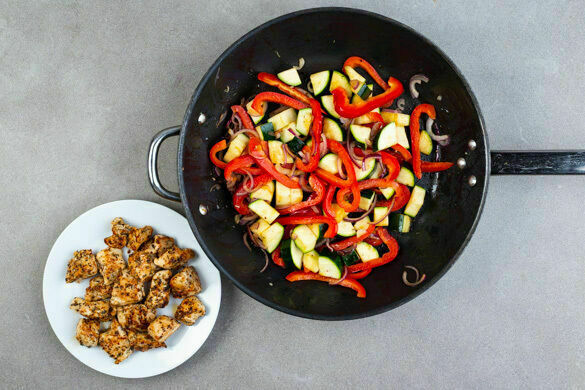 Das Fleisch in einer großen Pfanne 2–3Min. bei starker Hitze anbraten, dann auf einem Teller beiseitestellen. Die Zwiebeln, die Paprika und die Zucchini in derselben Pfanne mit 2EL Olivenöl 3–4Min. bei starker Hitze anbraten. Den Knoblauch dazugeben und 2–3Min. bei mittlerer Hitze mitbraten, bis das Gemüse gar, aber noch knackig ist.