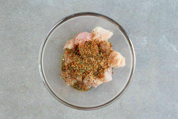 Das Fleisch trocken tupfen, in mundgerechte Stücke schneiden und mit der Gewürzmischung und 2EL Olivenöl vermengen.